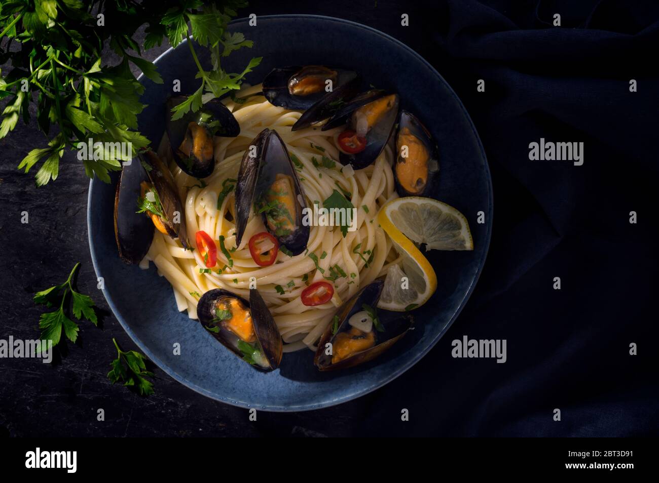 Steamed Mussels In Linguine Pasta In White Wine Sauce With Garlic Parsley And Red Chilli In A Blue Plate On A Moody Dark Blue Background Selective F Stock Photo Alamy